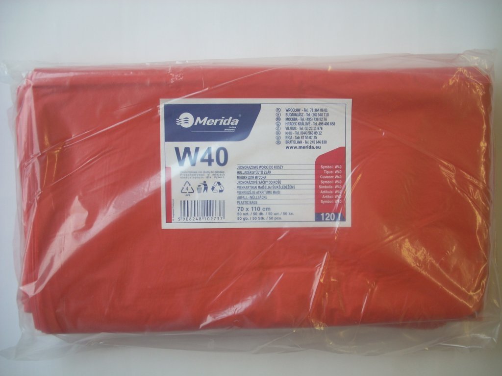 Pytle na odpadky červené barvy, s obsahem 120l o rozměrech 70 x 110 cm. Skládané do balíku po 50 ks, síla 38 mi, fólie LDPE.